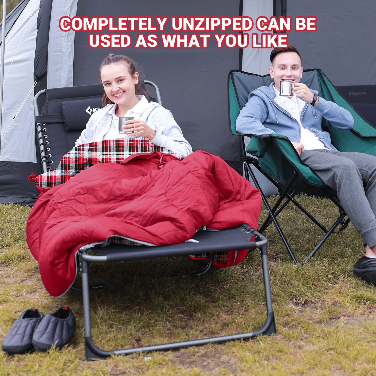 - The sleeping bag can be unzipped as a warm blanket or mat.