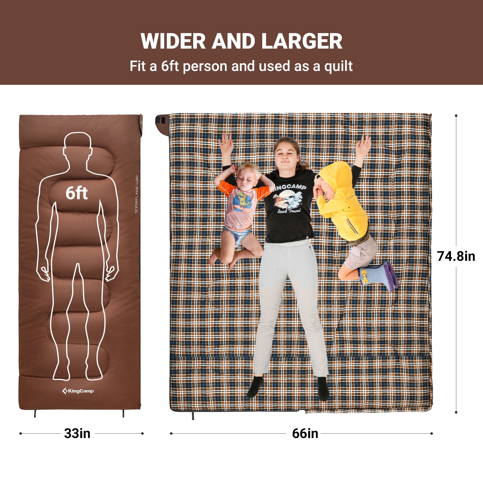 The KingCamp sleeping bag with flannel Liner is soft and warm, breathable, and skin-friendly. The weaving technology effectively prevents the internal filling from shifting to keep your sleeping bag warm at all times, and the Hydrophobic Polyester Fabric is Water-resistant and rip-stop, it's durable for resisting damage from stones, branches, and other natural elements and keep dry in a humid environment.
